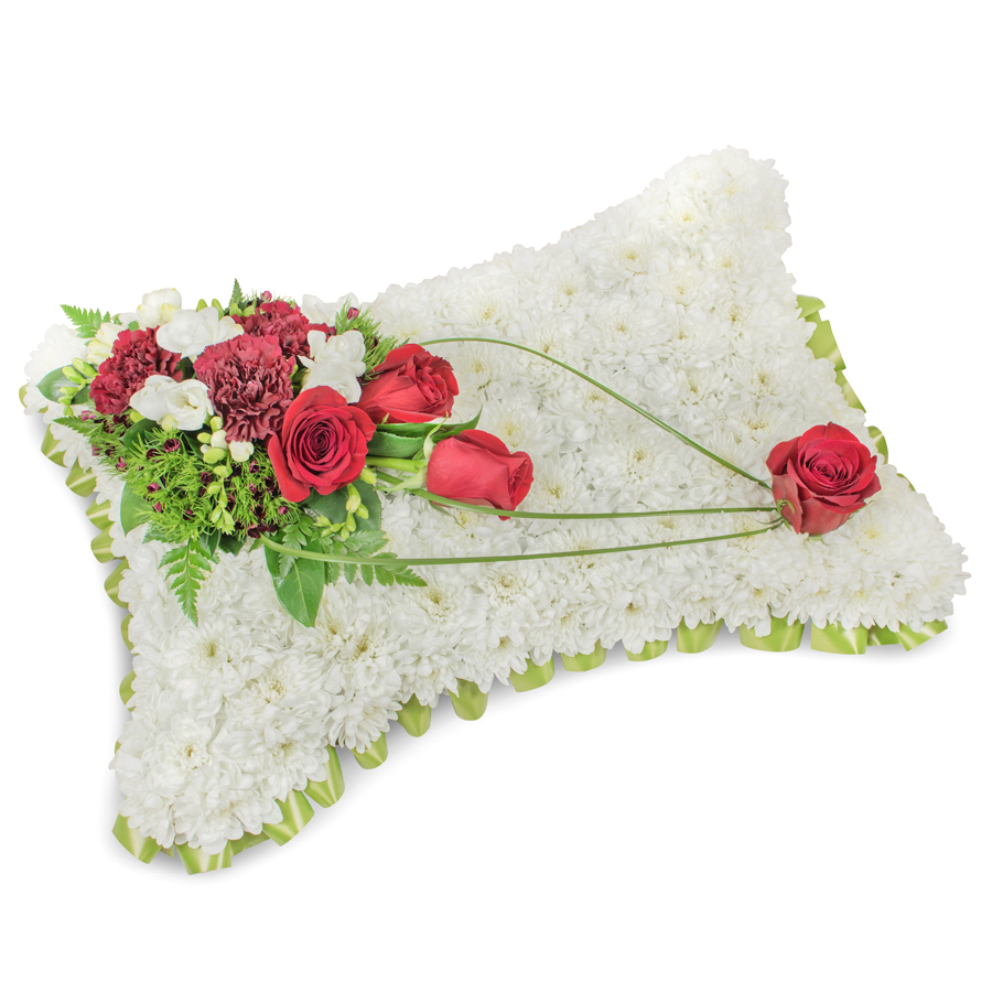 Express your heartfelt condolences with our Sincerest Sentiments Cushion, a graceful funeral tribute handcrafted by Flower Delivery Chinatown. This elegant cushion arrangement features a soft bed of white chrysanthemums, beautifully contrasted with rich red roses, fragrant white freesias and deep red carnations, delicately complemented by dianthus and arching bear grass. Designed to convey comfort, peace and respect, it's an ideal choice for funerals, memorials or to send sympathy to loved ones in times of loss.
